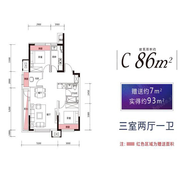 86平三室两厅一卫C户型,红色区域为赠送面积。该户型赠送7平米,实得约93平,空间面积利用率高,实用面积大。