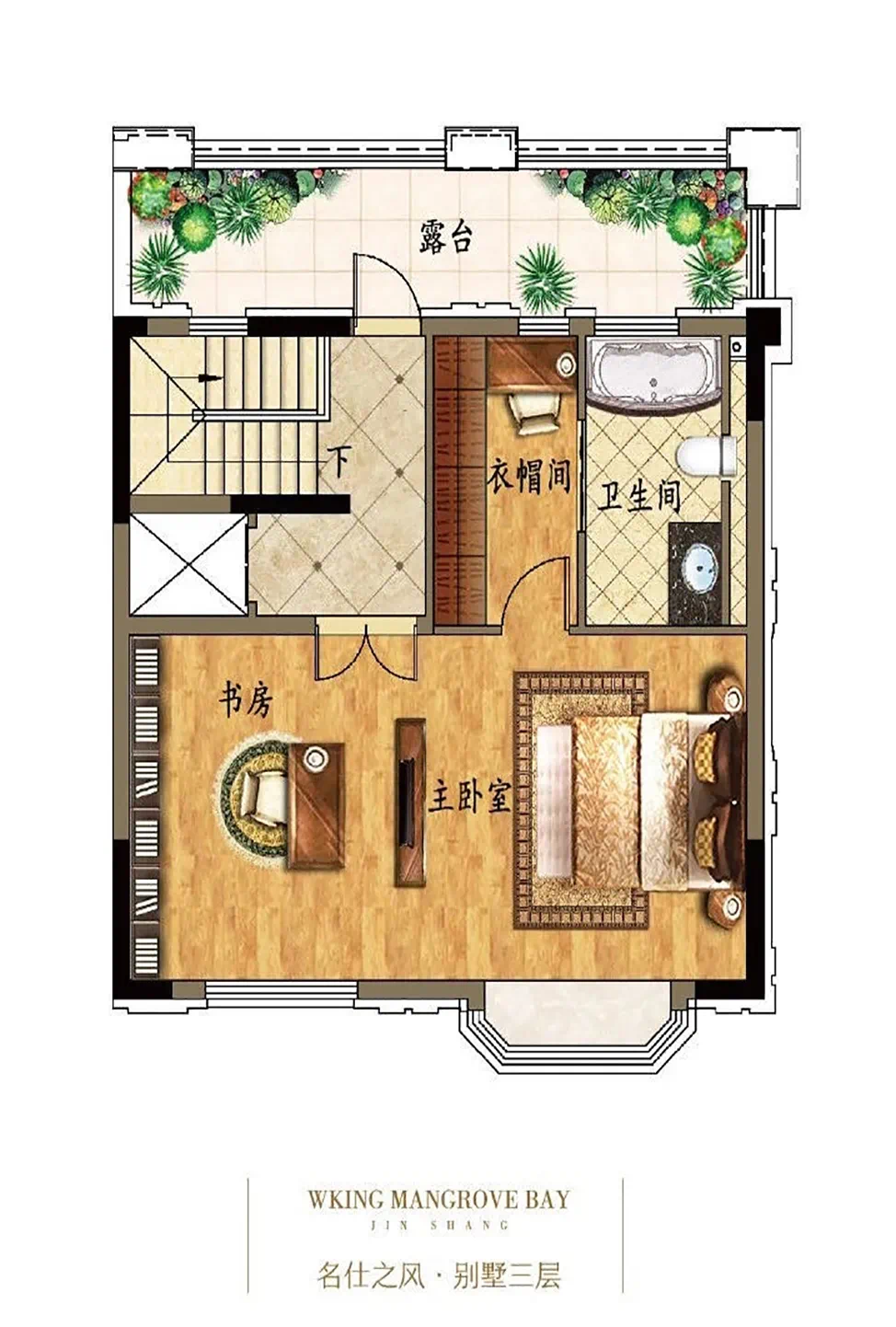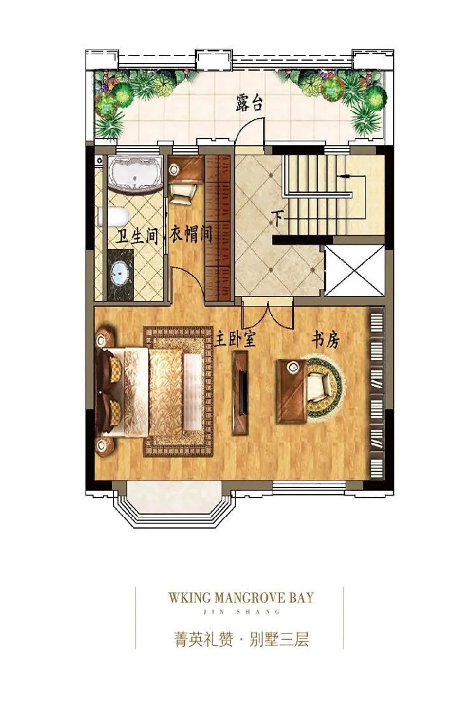 三层,豪华主卧套房、专属衣帽间、静谧书房、南北观景飘窗及超大露台……带来尊贵生活体验;
