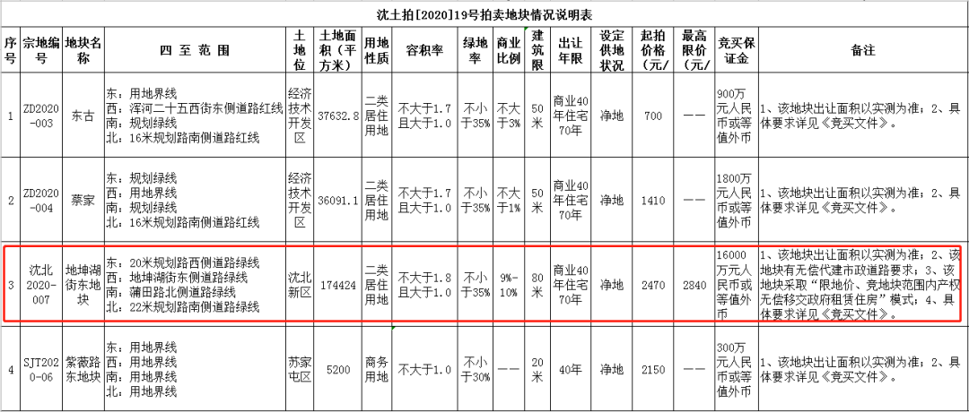 说完地坤湖街东地块,我们再来看看另外三宗地的信息。东古地块,位于经济技术开发区,东至用地界线、西至浑河二十五西街东侧道路红线、南至规划绿线、北至16米规划路南侧道路红线,土地面积37632.83㎡,用地性质为二类居住用地,容积率不大于1.7,商业比例不大于3%,起拍价格700元/建筑㎡。蔡家地块,位于经济技术开发区,土地面积36091.11㎡,用地性质为二类居住用地,容积率不大于1.7,商业比例不大于1%,起拍价格1410元/建筑㎡。