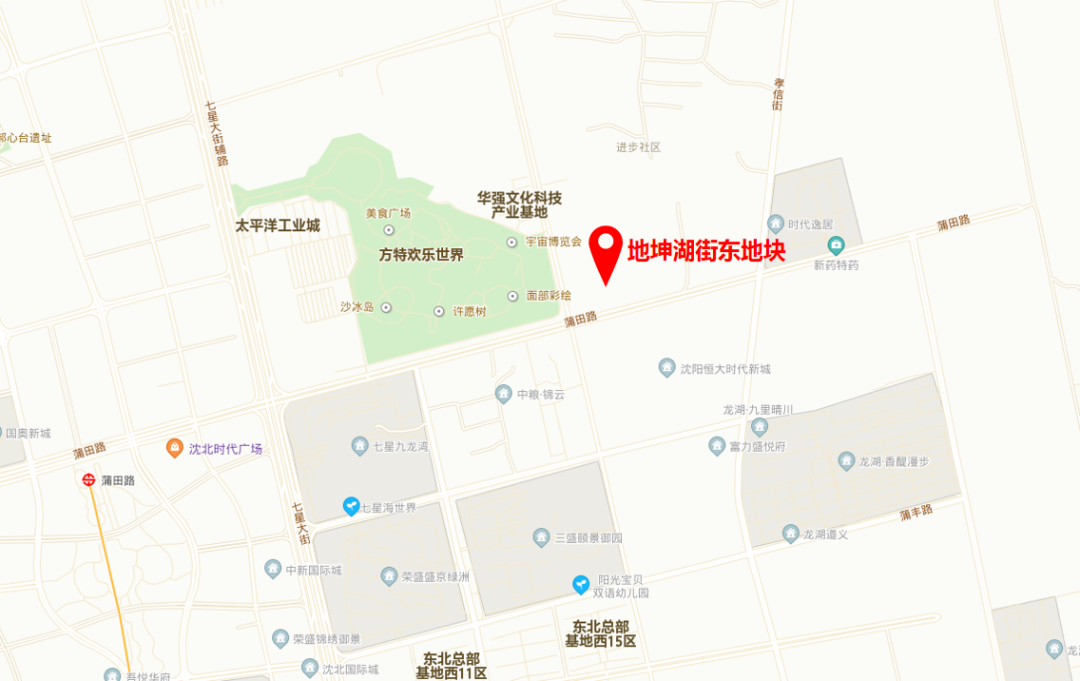 地坤湖街东地块位于沈北新区,土地面积174424平方米,用地性质为二类居住用地,容积率不大于1.8且大于1.0,商业比例9%-10%,绿地率不小于35%,出让年限商业40年,住宅70年,地块起拍价格为2470元/建筑平方米,最高限价为2840元/建筑平方米。该地块其他备注条件:1、该地块出让面积以实测为准;2、该地块有无偿代建市政道路要求;3、该地块采取“限地价、竞地块范围内产权无偿移交政府租赁住房”模式;4、具体要求详见《竞买文件》。从地图上我们可以看到:地坤湖街东地块南临蒲田路与恒大时代新城项目一街之隔;西临地坤湖街且紧邻沈阳方特欢乐世界。就地块周边情况来看,恒大、中粮、富力、龙湖、三盛、荣盛的前期进入,已经令地块1公里半径内有了最基础的生活配套;另外地块距离地铁二号线蒲田路站直线距离约两公里,可以满足日常的出行需求。回顾本年度的土拍我们可以发现,蒲河板块已经成为沈北土地供应的主力区域,中金、汇置、祥联、百益龙等多年深耕于此的房企依然很看好这里的发展前景。